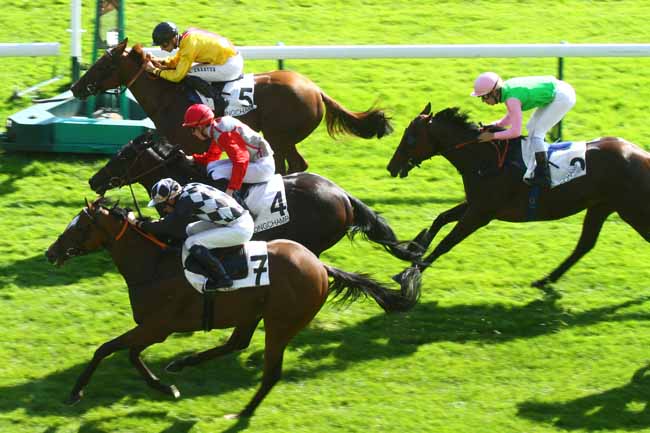 En photo, SMOKE ON THE WATER (7) et E. HARDOUIN s'imposent dans le PRIX DU MUSEE DES ARTS DECORATIFS Ă LONGCHAMP (R1C1) - Samedi 20 septembre 2014