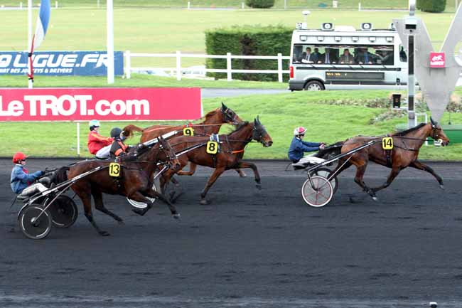 En photo, BLUE GRASS (14) et Y. LEBOURGEOIS s'imposent dans le PRIX D'EVIAN Ă PARIS-VINCENNES (R1C4) - Vendredi 9 janvier 2015