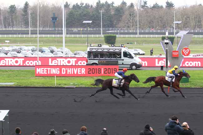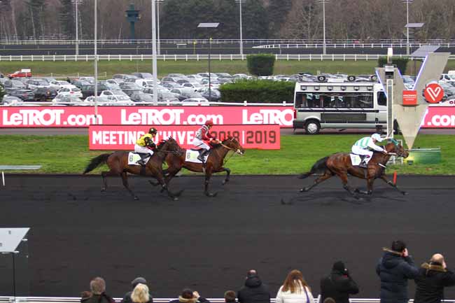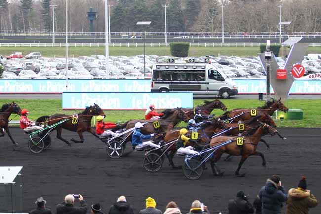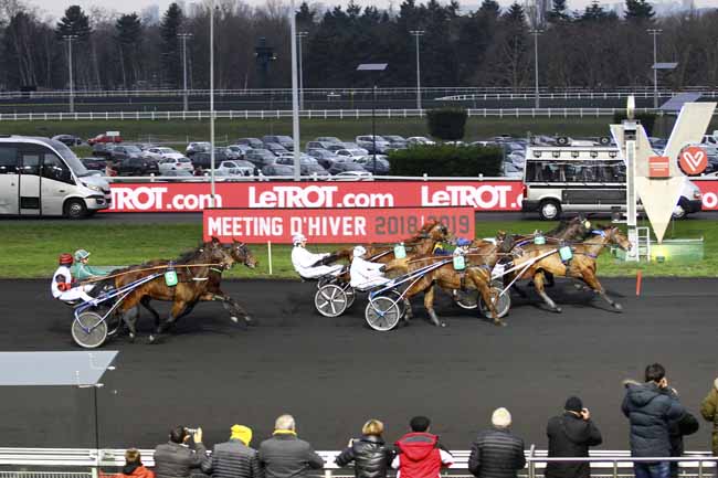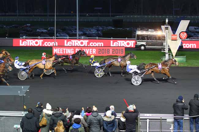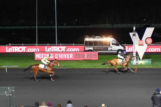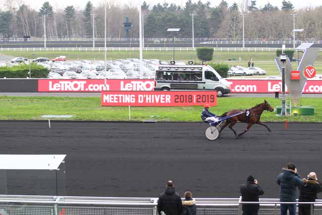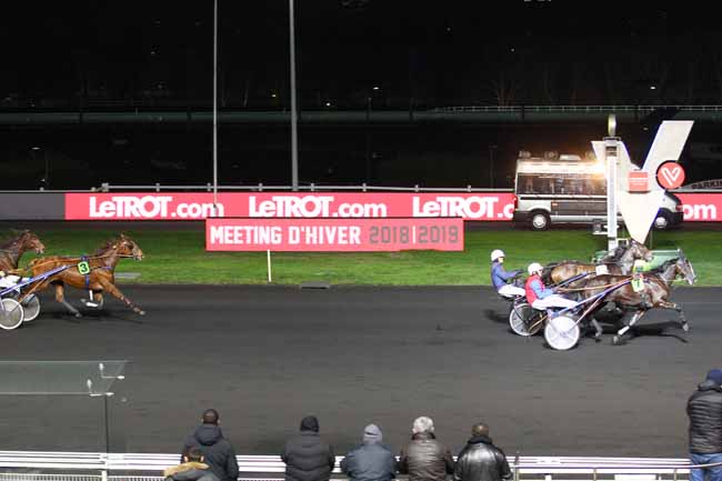 En photo, DEXTER CHATHO (11) et CH. BIGEON s'imposent dans le PRIX DE VIC-SUR-CERE Ă PARIS-VINCENNES (R1C6) - Dimanche 6 janvier 2019