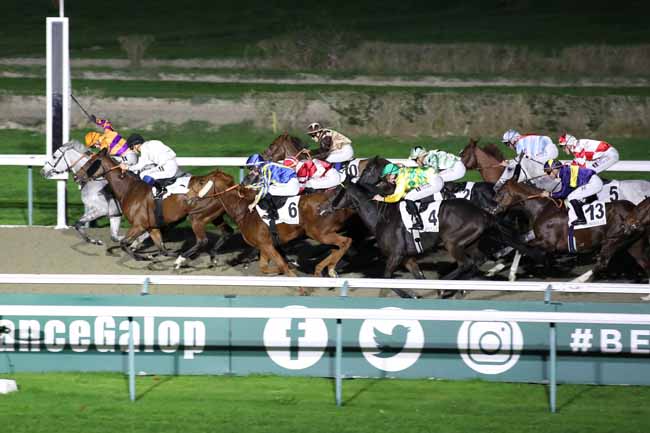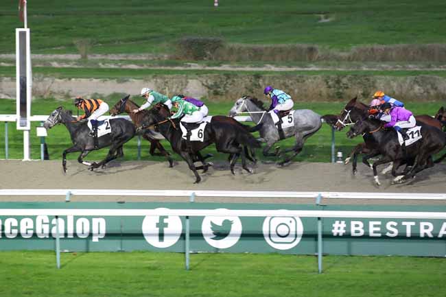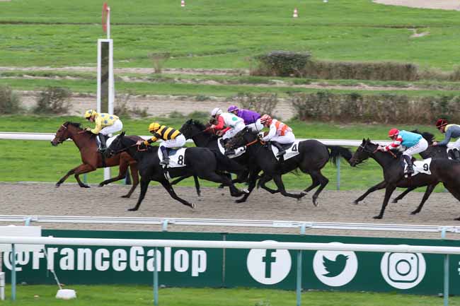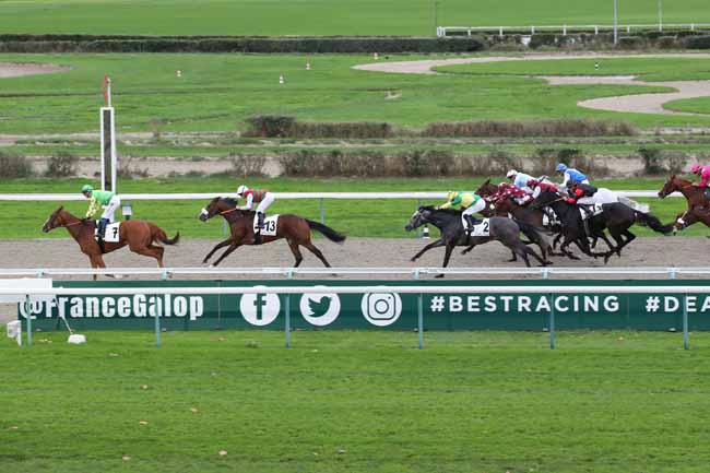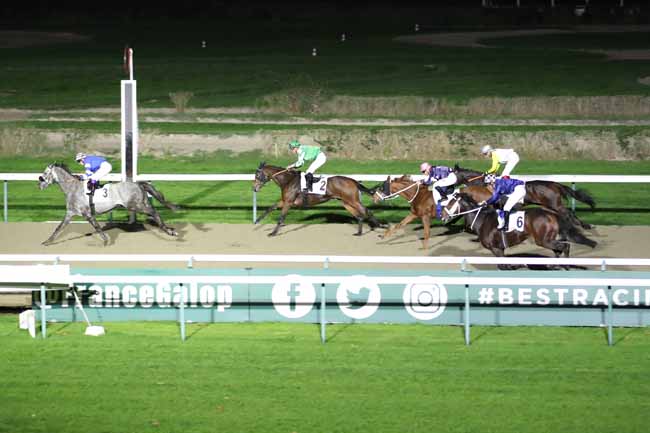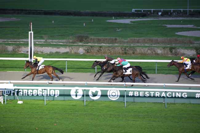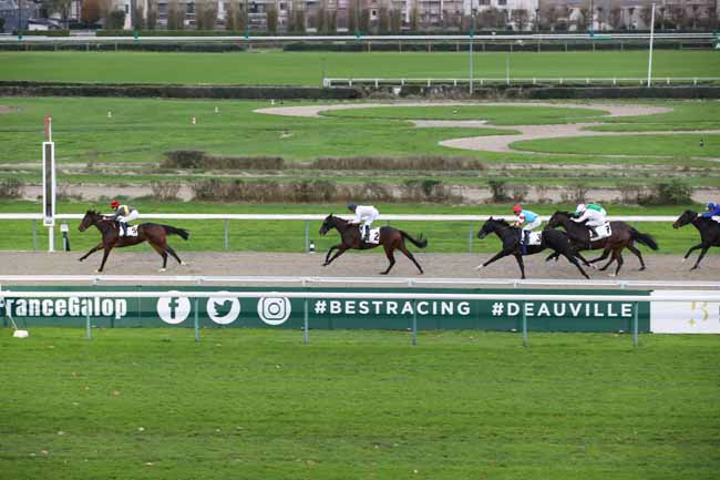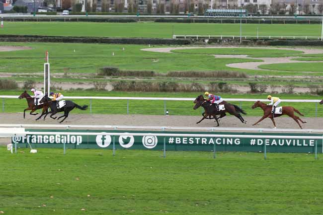 En photo, KIMI ORENDA (9) et GUYON M. s'imposent dans le PRIX DU CHATEAU DE CREVECOEUR Ă DEAUVILLE (R1C4) - Samedi 5 novembre 2022