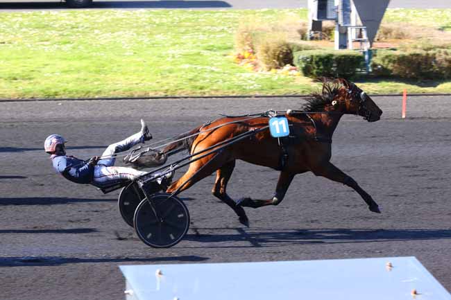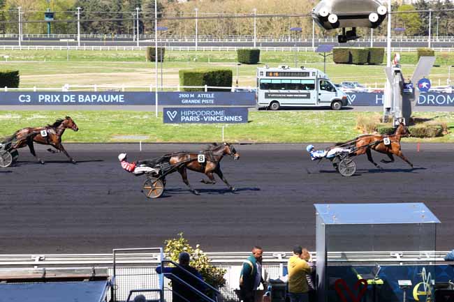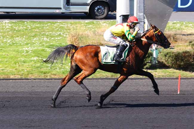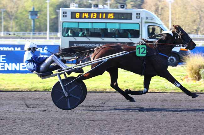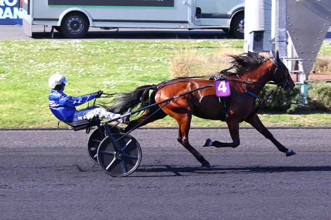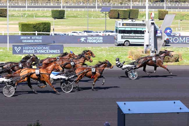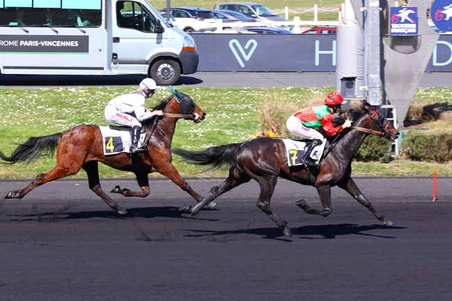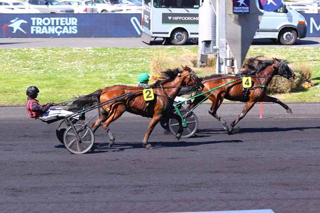 En photo, INEXESS BLEU (5) et ABRIVARD A. s'imposent dans le PRIX KERJACQUES Ă PARIS-VINCENNES (R1C5) - Samedi 5 avril 2025