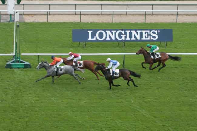 En photo, MR CHANCE (7) et BENOIST G. s'imposent dans le PRIX JUIGNE Ă LONGCHAMP (R1C4) - Lundi 4 avril 2011