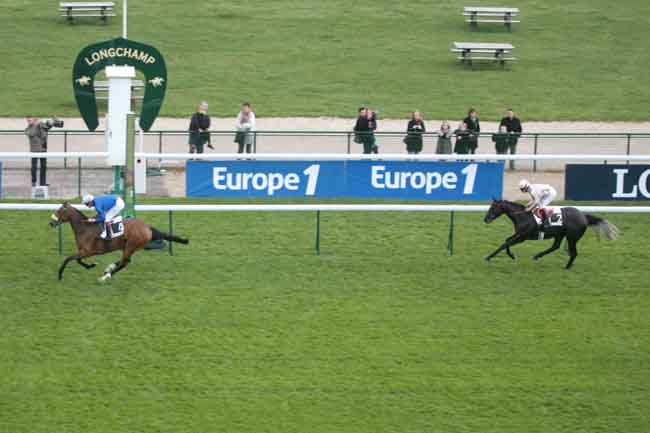 En photo, BEAUTY PARLOUR (4) et C. SOUMILLON s'imposent dans le PRIX DE LA GROTTE Ă LONGCHAMP (R1C5) - Dimanche 15 avril 2012
