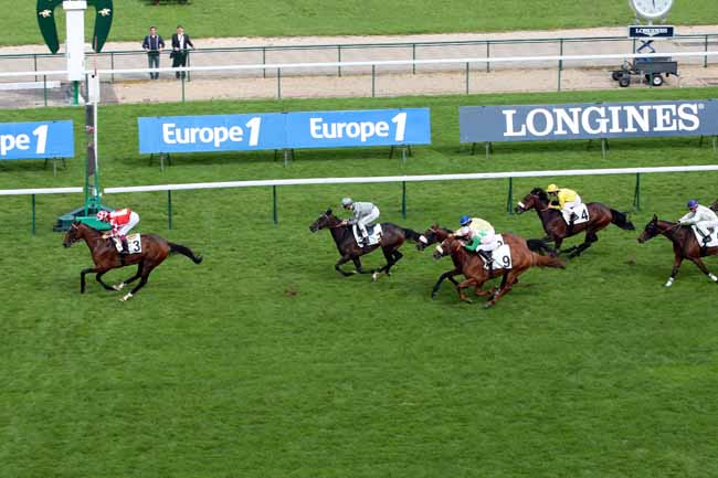 En photo, TARTARIN (3) et C. SOUMILLON s'imposent dans le PRIX DE L'ESPLANADE Ă LONGCHAMP (R1C8) - Lundi 11 juin 2012